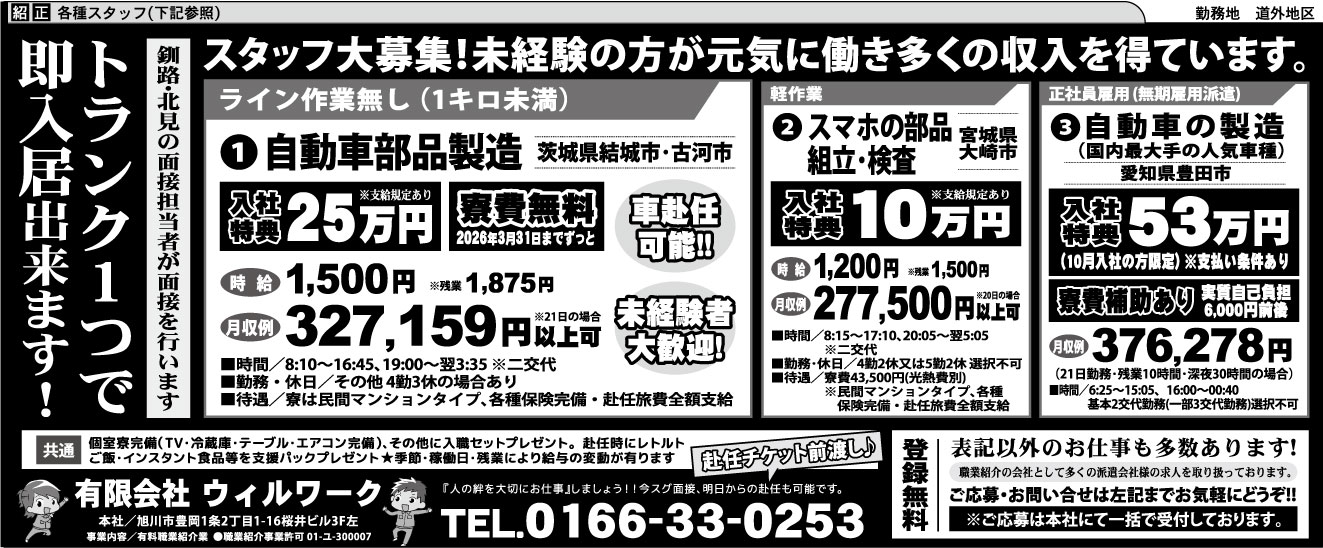 ①ライン作業無し(1キロ未満)★入社特典 25万円 ※支給規定あり ★寮費無料(2026年3月31日までずっと) ★車赴任可能! ★未経験者大歓迎!