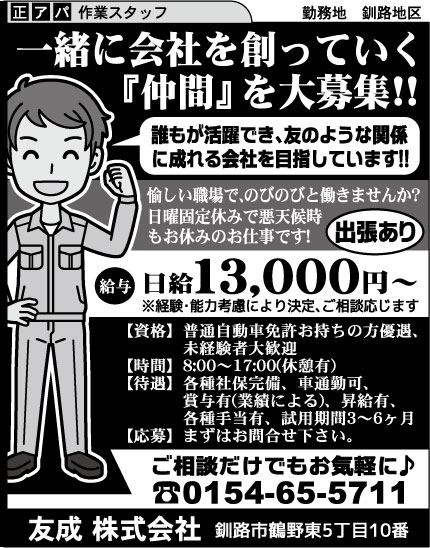 太平ビルサービス株式会社 釧路支店 清掃スタッフ 給与 ①時給1,075円 ②時給1,075円 ③時給1,075円 ④時給1,075円 ⑤時給1,075円 勤務 ①8:00~11:30 (3.5H)【勤務】週5日 ②7:00~10:30 (3.5H) 【勤務】週5日 ③8:30~12:00 (3.5H)【勤務】週5日 ④9:30~14:30 (4H)【勤務】週5日 ⑤4~9月 8:20~16:20、10月 8:50~16:20、11~3月 8:50~12:20【勤務】火木土・隔週日曜 シフト制長期可短時間勤務可平日のみ可未経験者歓迎学歴不問経験不問新卒者歓迎ブランクOK学生歓迎主婦(夫)歓迎フリーター歓迎かけもち可シニア応援AT車限定可交通費支給車通勤可無料駐車場扶養内勤務可転勤なし応募人数5名以上子育てママ在籍中