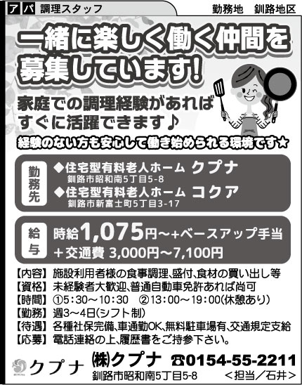 北海道ハピネス㈱ 帯広事業所 ①《人気求人》《増員急募!》レンタル用品の美化作業 ②《NEW》客室清掃 ③《NEW》客室清掃 ④調理補助・洗浄スタッフ 給与 ①時給1,120円 ②時給1,200円 ③時給1,300円+1,000円/日 ④時給1,350円 勤務 ①8:30~17:30(休90分) ②8:00~14:00 ※開始時間ご相談下さい ③9:00~15:00 ④8:00~16:30(休60分)※早く勤務が終了しても1日7.5時間補償 未経験者歓迎学歴不問経験不問ブランクOK各社保完備交通費支給制服貸与有給休暇車通勤可送迎寮・社宅無料駐車場週払い可