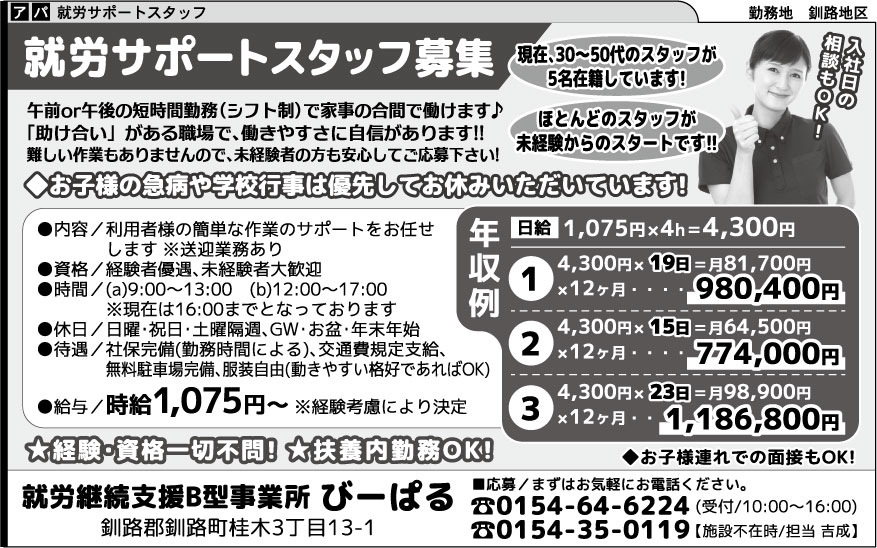 (担当:施設不在時/担当 吉成 ☎0154-35-0119)
