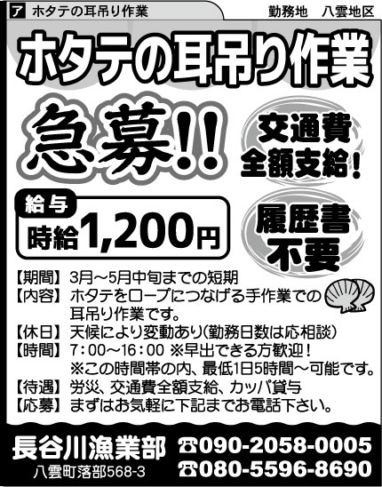 古田漁業部 ホタテ穴あけ・耳吊りスタッフ・丘周り作業員 給与 ①ホタテ穴あけ・丘周り作業員 時給1,200~1,500円 ②ホタテ耳吊りスタッフ 時給1,100~1,200円(歩合制も可) 勤務 7:30~16:30(休憩:朝/夕各15分・昼60分) 未経験者歓迎学歴不問経験不問ブランクOK主婦(夫)歓迎フリーター歓迎各社保完備交通費支給制服貸与車通勤可送迎急募履歴書不要応募人数5名以上子育てママ在籍中