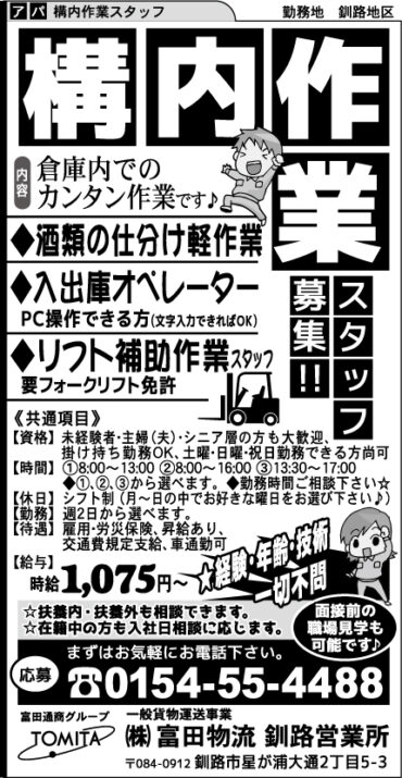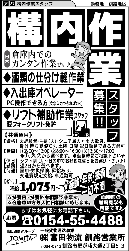 TOP  > 勤務地【釧路市・釧路町】  > ㈱富田物流 釧路営業所