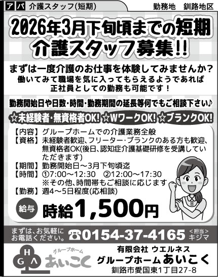 TOP  > 勤務地【釧路市・釧路町】  > グループホーム あいこく (短期)
