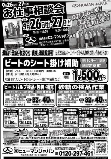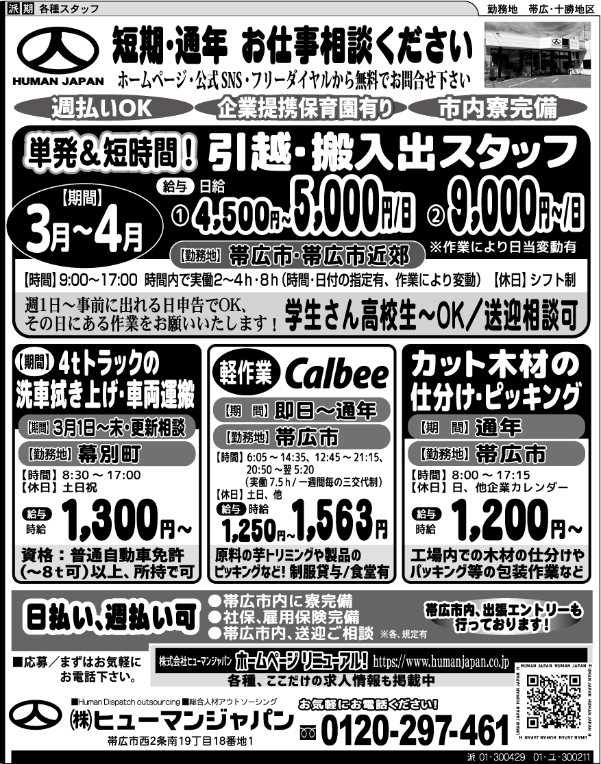 ●日払い、週払い可 ●帯広市内に寮完備 ●社保、雇用保険完備 ●帯広市内、送迎ご相談 ※各、規定有