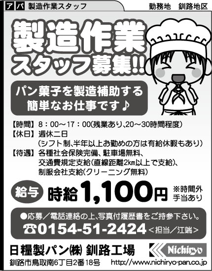 北海道ハピネス㈱ 帯広事業所 《NEW》製品の検品・整列作業 給与 時給1,430円 勤務 (a)5:00~14:00(休憩60分) (b)14:00~23:00(休憩60分) どちらか希望の固定勤務 未経験者歓迎学歴不問経験不問ブランクOK各社保完備交通費支給制服貸与有給休暇車通勤可送迎正社員登用無料駐車場週払い可
