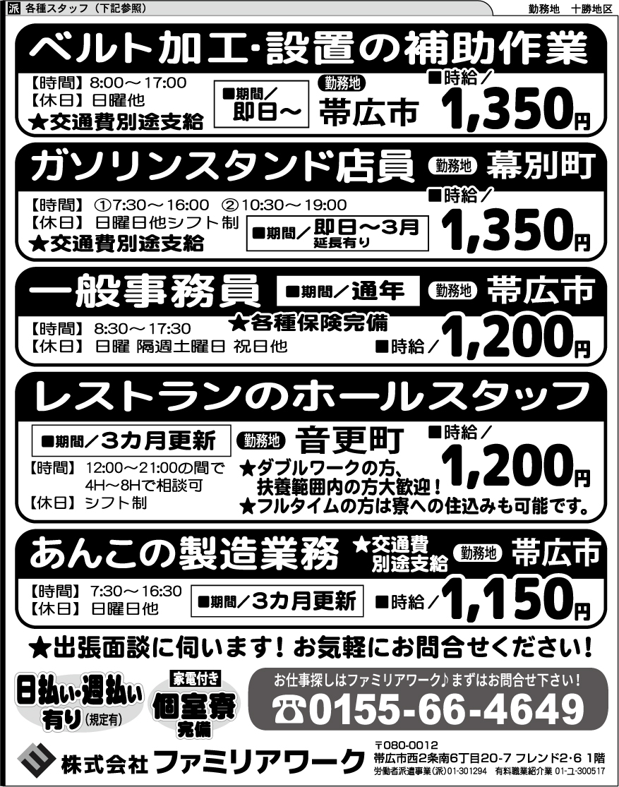 TOP  > 勤務地【帯広市内】  > ㈱ファミリアワーク