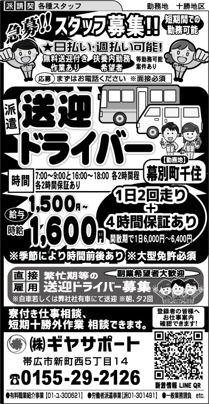 寮付き仕事相談、短期十勝管外作業 相談できます!!