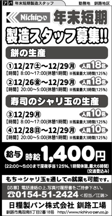 日糧製パン株式会社 釧路工場(年末短期製造スタッフ