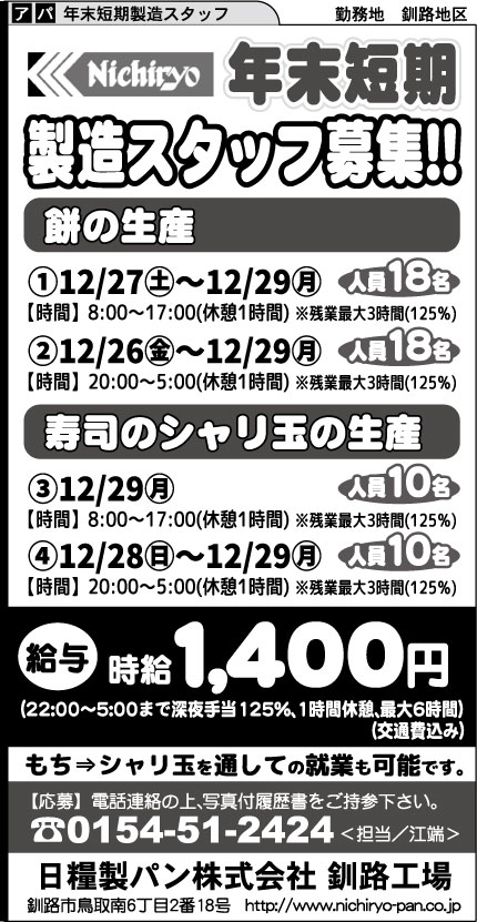 TOP > 日糧製パン株式会社 釧路工場(年末短期製造スタッフ(掲載終了)